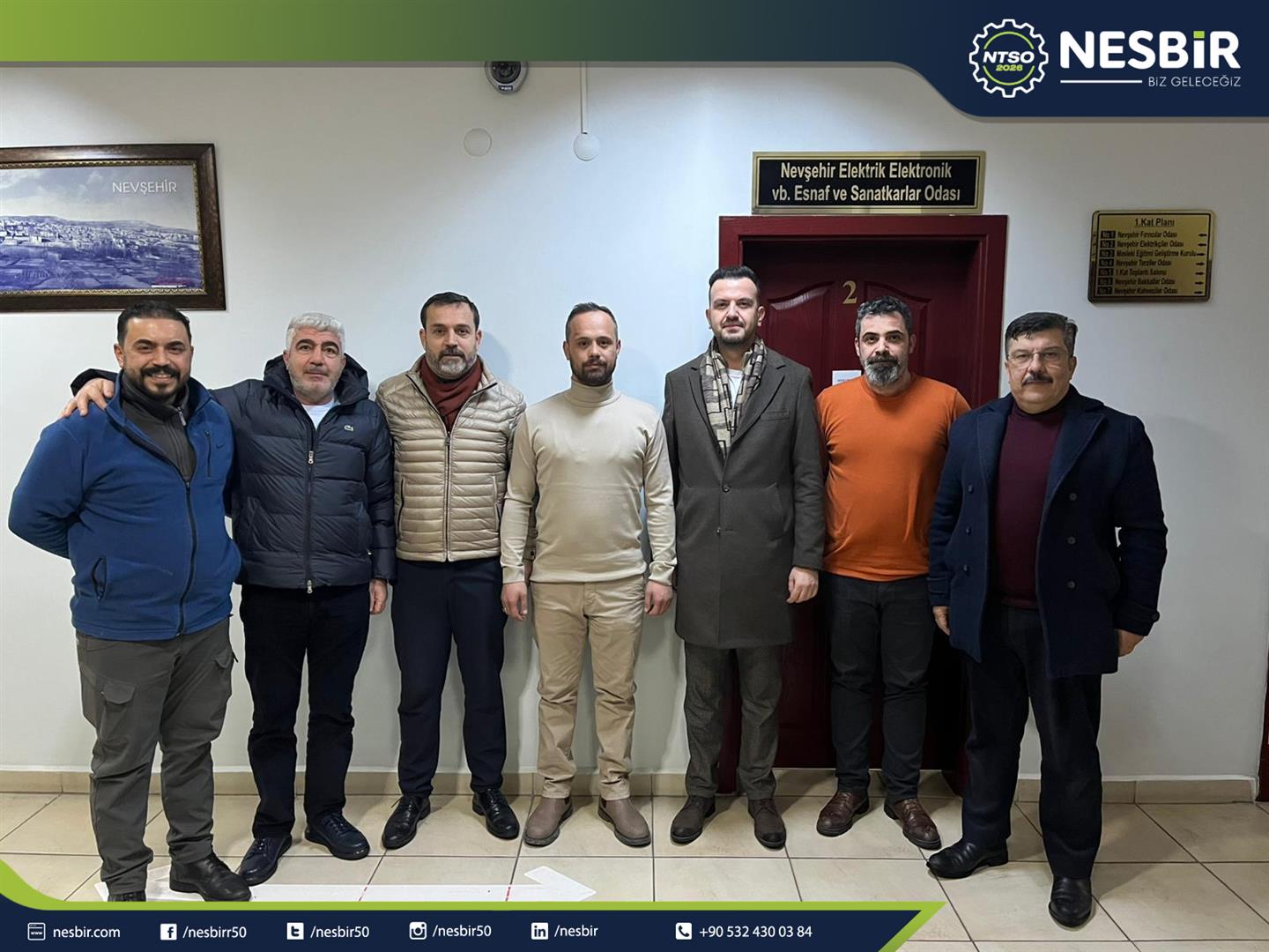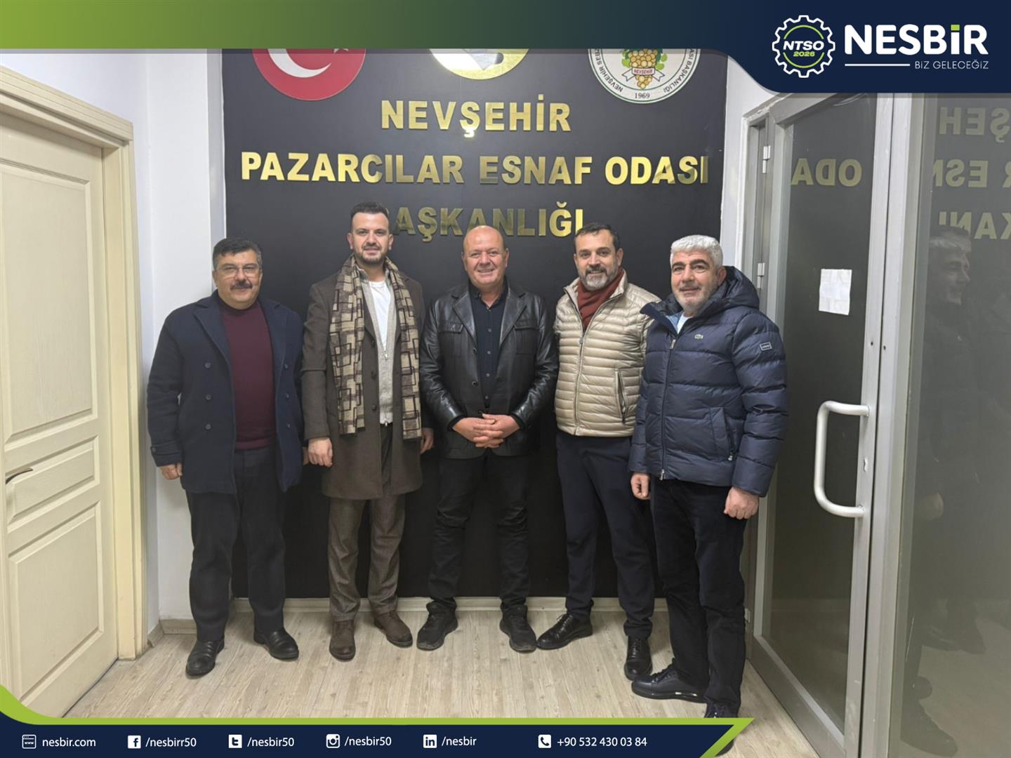 NESBİR Heyeti; Nevşehir Karoserciler, Marangozlar ve Ağaç İşleri Esnaf ve Sanatkârlar Odası Başkanı Ramazan Vedat KORKMAZ, Nevşehir Esnaf ve Sanatkârlar Odası Başkanı Mehmet ERGİN, Nevşehir Kahveciler Esnaf Odası Başkanı Necati DAŞLICA, Nevşehir Pazarcılar Odası Başkanı Selim ÖZMEN ile olağan genel kurulda göreve seçilen Nevşehir Madeni İşler Esnaf ve Sanatkârlar Odası Başkanı Yıldırım ULUCAN ve Nevşehir Elektrik ve Elektronik Esnaf Odası Başkanı Tayfun BALCI’yı ziyaret ederek hayırlı olsun dileklerini iletti.